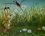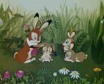 Les trois enfants alors réunis au seuil du terrier tournent et roulent ensemble et font des petits sauts de joie qui les mènent à quelques pas de leur foyer. Toutefois s'il est heureux de se retrouver et de jouer au dehors, maman lapin se doit aussi d'éduquer quelque peu ses enfants et ce matin-là elle leur apprend à faire d'amples bonds, ce que font les deux plus jeunes lapins obéissants pendant que le plus âgé, curieux de ce qui l'entoure, s'amuse à observer la nature qui s'exprime alors sous ses yeux sous la forme d'un lucane cerf-volant voletant autour de lui et d'une sauterelle avec laquelle il partage quelques sauts.