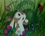 Maman lapin, bienveillante, s'aperçoit évidemment que l'aîné de ses élèves est quelque peu dissipé et lui fait comprendre avec gentillesse que ce n'est pas bien puis, pour les récompenser de ces petits efforts, elle invite ses enfants à cueillir et déguster des fleurs de trèfle rouge. Mais alors qu'il s'apprête lui aussi à manger une délicieuse fleur, le regard du jeune lapin quelque peu distrait se porte un court instant sur un joli papillon et il ne voit pas au moment de croquer la plante qu'une grosse abeille s'est posée sur celle-ci. Le temps de l'étonnement passé et d'une étrange sensation vrombissante et de bourdonnement en bouche, il recrache l'insecte qui fort mécontent de cette mésaventure poursuit le petit lapin qui, fuyant à toute vitesse, finit sa course dans un jardin après s'être faufilé par un trou dans une clôture.