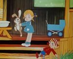 Pendant ce temps, Katya tente de nourrir le petit lapin qu'elle tient dans ses bras avec beaucoup d'affection puis, le croyant un peu malade, le couche dans un landau pour qu'il se repose : il s'y endort rapidement épuisé par la frayeur éprouvée. Puis Katya s'éloigne un moment du perron. Les deux petits lapins venus porter secours profitent de cet instant pour s'approcher de l'endroit où est retenu leur aîné, le découvre à demi endormi dans la poussette qu'ils font rouler le plus vite possible vers la barrière, au lieu où se trouve la trouée où ils arrivent si précipitamment qu'ils renversent le landau et son contenu. Maman lapin passe alors ses bras à travers l'ouverture pour attraper son enfant encore inconscient que lui tendent de leurs petites pattes les deux cadets qui se faufilent à la suite par cette brèche, synonyme dans ce sens de liberté. Katya découvre évidemment avec une grande tristesse la disparition du petit animal...