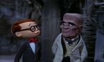 Outre la musique, l’aspect enfantin d’ordinaire présent dans les récits de Rankin Bass est ici saupoudré d’un esprit plus grinçant que d’ordinaire, mêlant aux jeux de mots faciles et à l’humour slapstick des sous-entendus à destination des adolescents et des adultes (notamment via Francesca, probablement le personnage le plus sexualisé de l’histoire de la stop motion). Éloignés du style habituel du studio tout en rondeurs rassurantes, les designs assurés par Jack Davis confèrent énormément de caractère aux personnages que les comédiens interprètent avec talent : Boris Karloff joue un baron Frankenstein dont la sympathie tranche avec son inquiétante découverte à l’origine de l’intrigue, Phyllis Diller incarne la Fiancée extravertie du monstre avec un plaisir communicatif et Gale Garnett dans le rôle de Francesca s’inscrit avec bonheur dans la tradition des femmes fatales. Mais la performance la plus mémorable est bien celle du vétéran du doublage Allen Swift qui assure à lui seul l’intégralité des seconds rôles avec une impressionnante élasticité, soit plus de 15 personnages différents ! Entre un Dracula à la voix pincée, un Felix Flanken doté d’une diction à la James Stewart, un Homme Invisible au timbre bonhomme, un chef cuisinier à l’accent italien et un majordome zombie avec le phrasé particulier de l’acteur Peter Lorre – en plus du physique –, le film fait figure de manifeste des capacités d’acteur de Swift. L’animation faite de mouvements bruts et de poses figées renforce l’aspect comique des situations et se fond parfaitement dans la fantaisie ambiante.