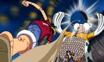 Sur le fond, hormis ceux déjà présentés, on retrouve d'autres personnages tirés de la série. Ainsi, Gan Forr et des Skypiéns sont présents en tant qu’arbitres. On peut aussi voir en caméo (figuration) les personnages de Wapol et de Pandaman lors du dénouement. Et des publicités “Marine”, “Captain Kuro” et “Baggy” sont présentes autour du stade.